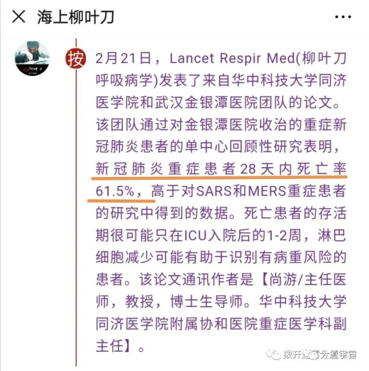 当时武汉重症28天内死亡率高达61.5%,但是他们还是很排斥中医。李文亮也还在用钟南山治疗非典的方法。