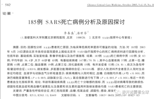 《中国危重病急救医学》2003年10期论文《185例SARS死亡病例分析及原因探讨》对北京2003年6月20日各综合医院上报的185份死亡病例进行了检讨。