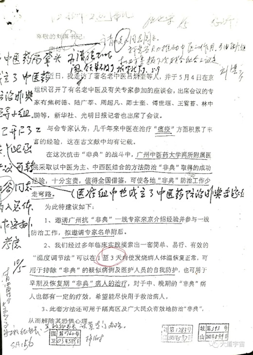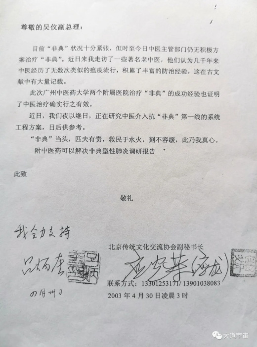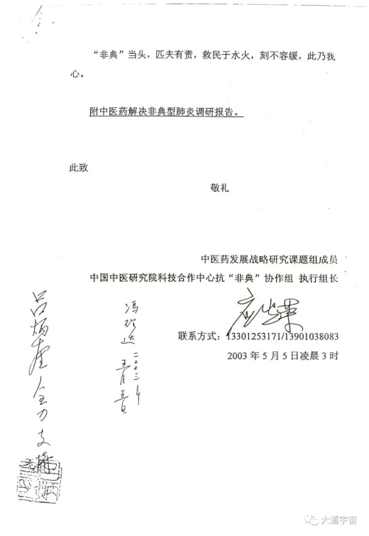 我拿出吕老的信,告诉他治非典,中医有办法。他不屑的对我说:“你们中医又想干什么!?” 我说广州中医药大学一附院治非典很好,他同样轻蔑地不认可。