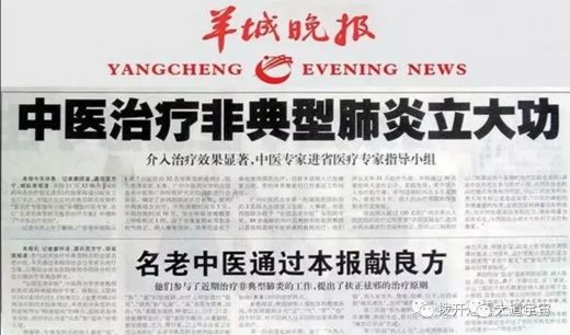 早在2003年2月11日广州《羊城晚报》就发表了《中药综合治疗初见成效》。2月17日《羊城晚报》又刊登文章《中医治疗非典型肺炎立大功》,介绍了中医中药治疗SARS的显著效果和治疗经验。