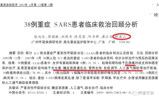广州呼吸疾病研究所的论文《38例重症SARS患者临床救治回顾分析》记录了钟南山的治疗方法和效果。