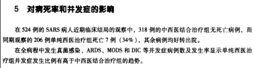 国务院研究室原副司长陈永杰等人在给国务院的报告中指出:中医药介入后,北京非典的死亡率下降为之前的五分之一。