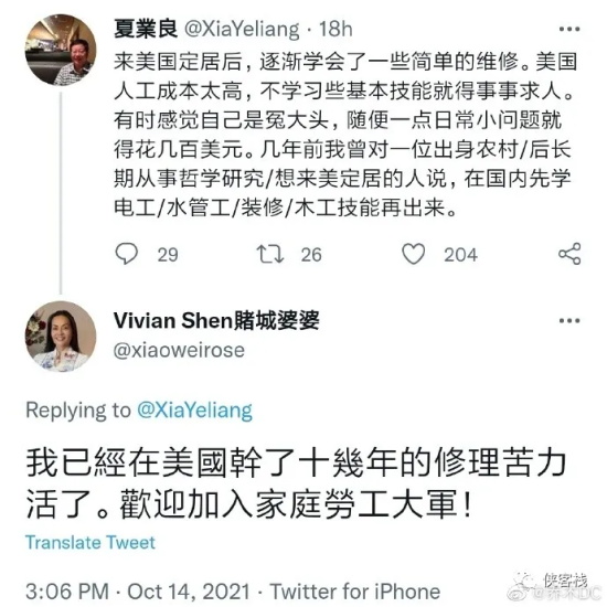 帖子上,夏业良称:来美国定居后,逐渐学会了一些简单的维修。美国人工成本太高,不学习些基本技能就得事事求人,有时感觉感觉自己是冤大头,随便一点日常小问题就得花几百美元。几年前我曾对一位出生农村、后长期从事哲学研究、想来美国定居的人说,在国内先学电工、水管工、装修、木工技能,再出来。