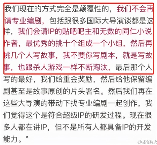 他表示,将不再请专业编剧,而是请各种写手写故事,实现打造超级IP的目的。
