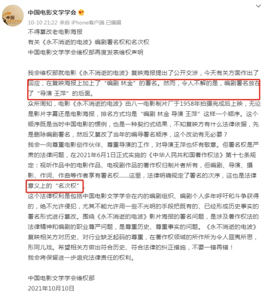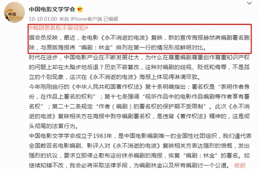 中国电影文学学会很快发表长文,对此进行斥责,表示「编剧署名权不容侵犯」。