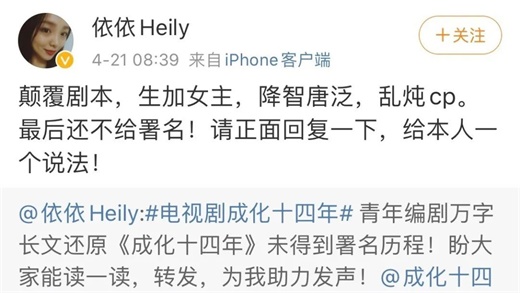 就像之前就出现过年轻编剧参与《成化十四年》剧本编写,却没有获得署名的事。