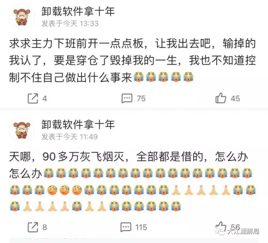 前两天跟风开了多单的多头,全部被套住。一个小炒家,被死死套住后,发贴哀求说:求求主力下班前开一点点板,让我出去吧,输掉的我认了,要是空仓了毁掉我的一生,我也不知道控制不住自己做出什么事来。这个小炒家借了90万多,作为保证金,参与动力煤期货跟风做多,现已全部亏完。