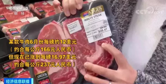 日前,国内媒体记者来到洛杉矶一家大型连锁超市,对美国商品价格和供应情况进行了调查。发现肉类价格近期大幅上涨,某款牛肉6月份每磅价格大约12美元(约合每公斤166元人民币),但现在已经涨到每磅16.97美元(约合每公斤237元人民币)。