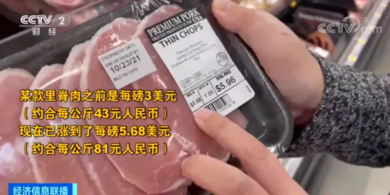 猪肉的价格也涨了不少,某款里脊肉之前每磅3美元左右(约合每公斤43元人民币),而现在已经涨到每磅5.68美元(约合每公斤81元人民币)。