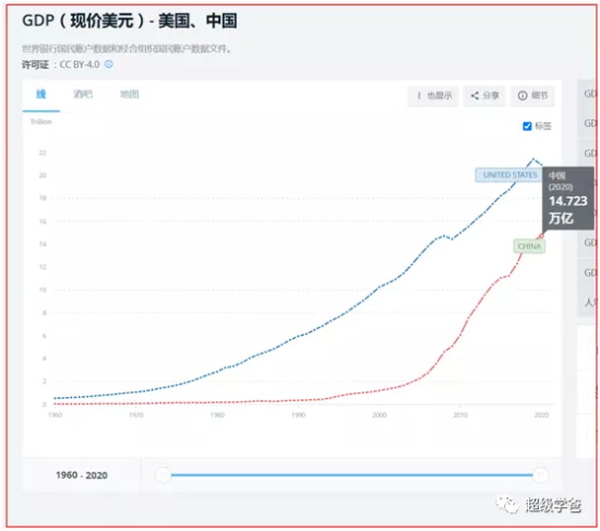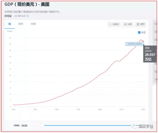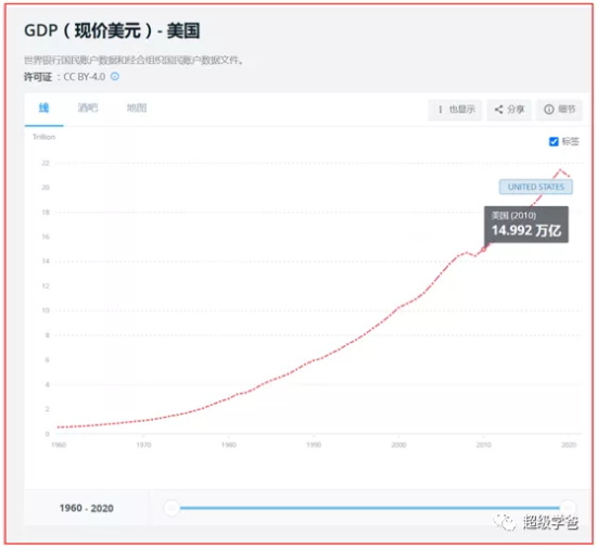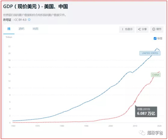 再看美国。2010年美国的GDP是14.992万亿美元,2020年是20.937万亿美元,十年增长量是 5.945万亿美元。
