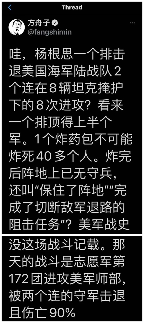 1、方舟子说:“看来一个排顶得上半个军。”言下之意,志愿军得半个军才能顶得住美国海军陆战队两个连的进攻。实际情况是杨根思一个排打美军315人,美军伤亡近170人。(美军14小时内伤亡了170人,大部分由杨根思所率领的排造成,因为之后美军没有进行像样的进攻了。)