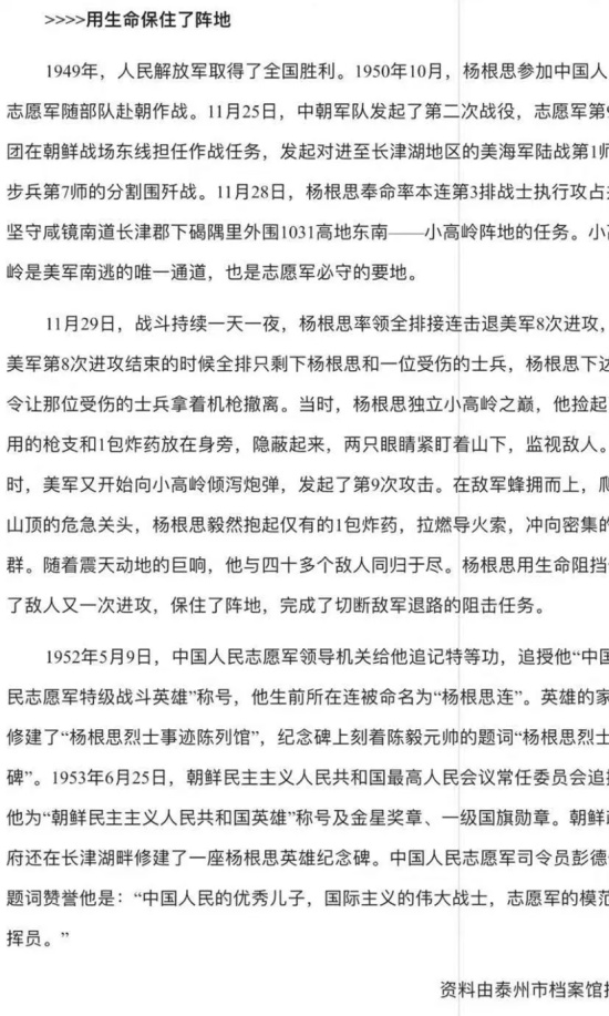 1、我们可以看到,泰州是杨根思的家乡,可泰州市档案馆对杨根思事迹的介绍居然还出现错误。教育部承担教书育人的重责,介绍我们的英雄,居然也出现错误。应该吗?有理吗?