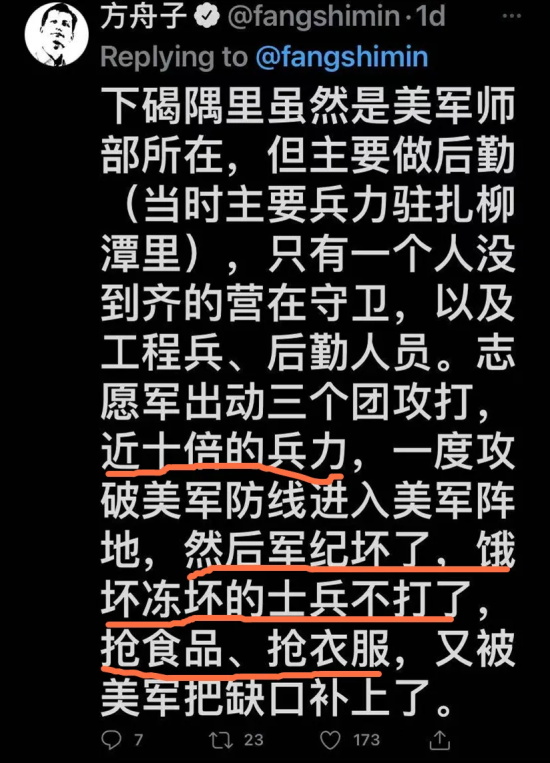 2、方舟子说:“一度攻破美军防线进入美军阵地,然后军纪坏了,饿坏冻坏的士兵不打了,抢食品、抢衣服”。