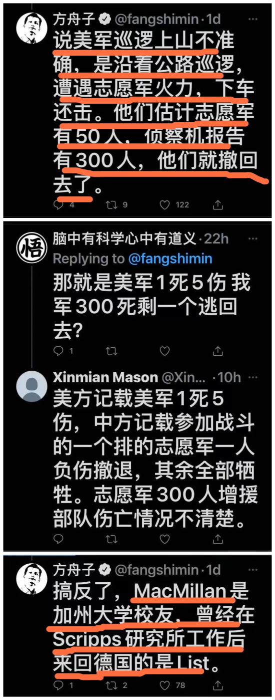 点评:这段话是谎言里掺一点点真,确实出现了志愿军扒掉被打死的美军皮大衣的情况。凭什么不扒呢?我们的战士就该被冻死?但是到方舟子嘴里就变成味道了,变成了抢。这是打仗,美军没被打死,怎么抢啊,他以为拦路抢劫呢。这个狗东西在美国被抢劫时估计是不敢反抗的,但美军有枪有炮有飞机有坦克,没傻到白白给志愿军抢。