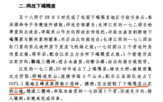 我们可以注意到两张截图都出现了一个高地名称,教育部官网写的是“1071.1高地”,泰州市档案馆写的是“1031高地”,教育部官网是对的,泰州市档案馆写错了。那么这个1071.1高地在哪呢?在下碣隅里的东边,所以我军和美军都叫这个高地为东山。