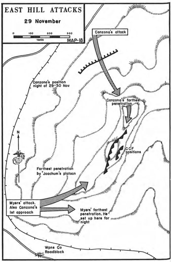 1950年11月28日晚,志愿军58师对下碣隅里的美军发起攻击,172团攻击1071.1高地得手,对下碣隅里形成极大威胁。11月29日凌晨5时30分,下碣隅里的美军指挥官里奇中校命令陆战1师1团3营主任参谋迈尔斯少校率部队反击。以至于迈尔斯所率部队虽然得到了陆战1师第1工兵营A连的支援,却再也无力取得任何进展。(这是多出来的)