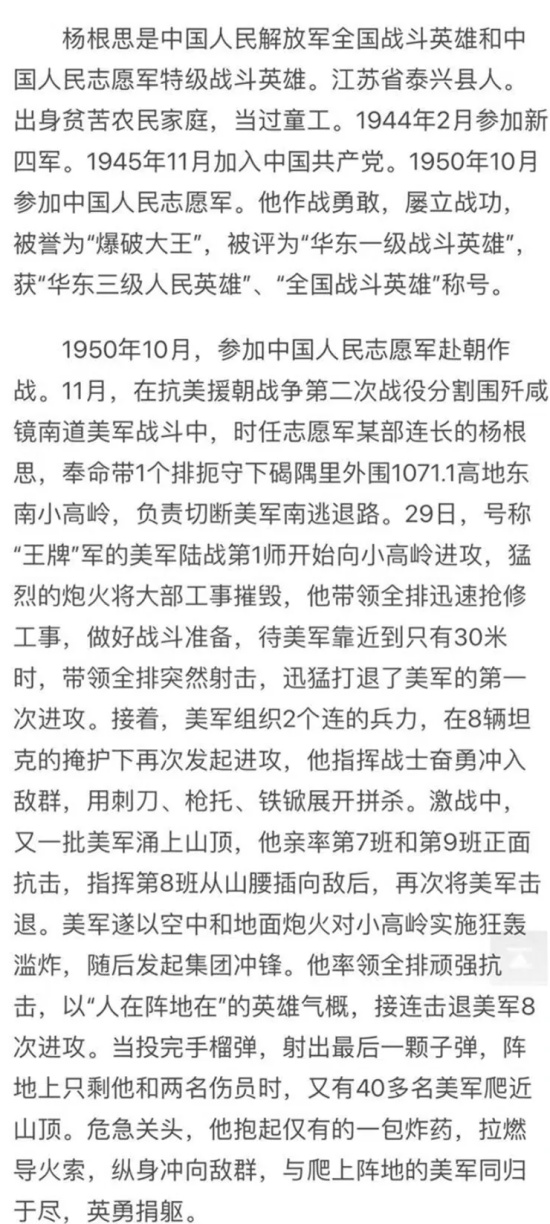 1、第一张图和第二张图是杨根思的简要事迹。方舟子说“是中国军方关于杨根思英雄事迹的详细介绍”,第一张见上图,第二张图见下图。