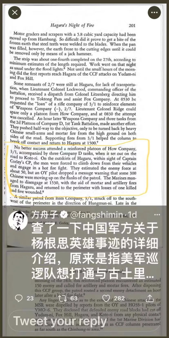 2、在方舟子翻阅了美国海军陆战队朝鲜战争官方战史《长津水库之战》后,方舟子对杨根思那次战斗内容的叙述又和之前不一样了。那么这次他对了吗?