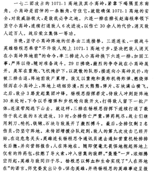 除了高地名称写错之外,杨根思所部的任务也写错了。杨根思当时的任务并不是切断美军南逃的退路,那时候还没到美军南逃的时候。当时志愿军处于进攻状态,打下1071.1高地对下碣隅里的美军产生严重威胁,所以到了白天美军就要反攻。这只是防御美军反扑。