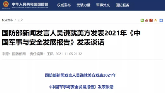 北京时间11月4日,美国国防部发布2021年《中国军事与安全发展报告》,报告罔顾事实、充斥偏见,妄议中国国防政策和军事战略,捏造所谓“中国军事威胁”,无端指责中方在核领域的力量建设,在台湾等问题上干涉中国内政,中方对此表示强烈不满和坚决反对,并向美方提出严正交涉。