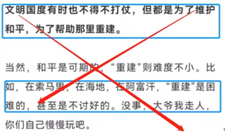 文章作者接着说,“战争首先要讲一个是非曲直,不是想打就能打的。特别是在当代社会,发动对外战争的合理理由几乎是不存在的。只要敢于玩火,结局都不会太好”。或许是感觉无法自圆其说,又或许是为了替美国多次发动对外战争辩解,作者随后笔锋一转,说“在当代社会,文明国度也会偶尔出兵,但都不是为了侵略,而是为了制止战争。”