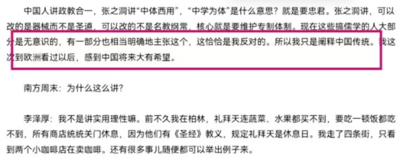 实际上,李泽厚和公知们是有所不同的,他并不是个完全的新自由派,他更像是个维护旧时代道统,并且以西方视角诠释传统中国“优点”的“士大夫”。