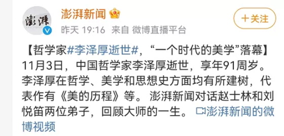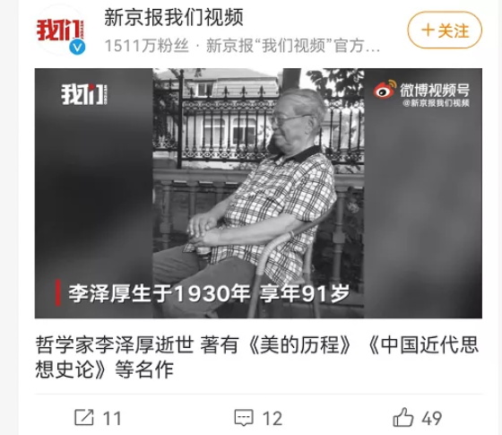 我不知道凤凰网、新京报、南方周末、澎湃新闻都在悼念些什么,我也不知道微博热搜那一群媒体人、律师们在纪念什么……某些人连李泽厚的书都没翻过,就开始“先生千古”了。