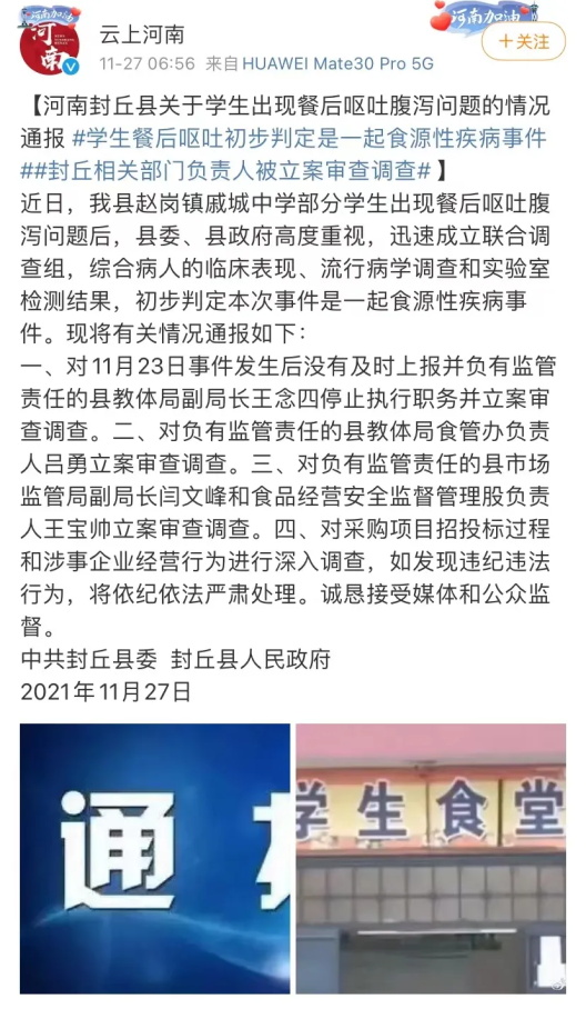 昨天,事件有了新的进展,相关部门针对学生出现餐后呕吐腹泻问题发布了情况通报: