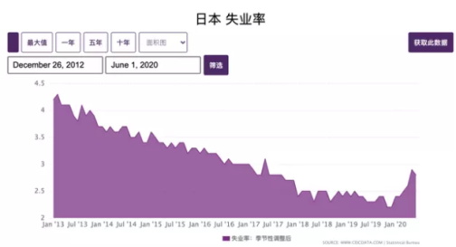 不可否认,量化宽松在早期是有效的。2012-2014年间,日本经济开始快速恢复和增长,失业率也从2012年的4.5%一路降到了2.5%以下。