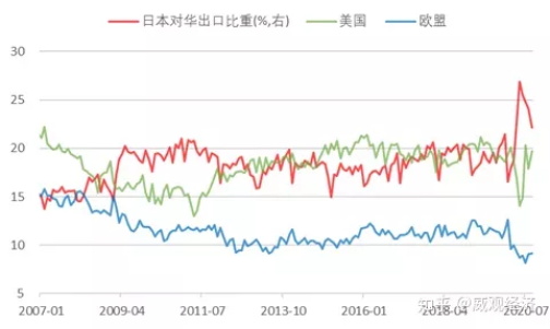 但根据日本财务省发布的数据,2020年,日本对中国出口所占比重达22.9%,超过了对美国的出口比重。