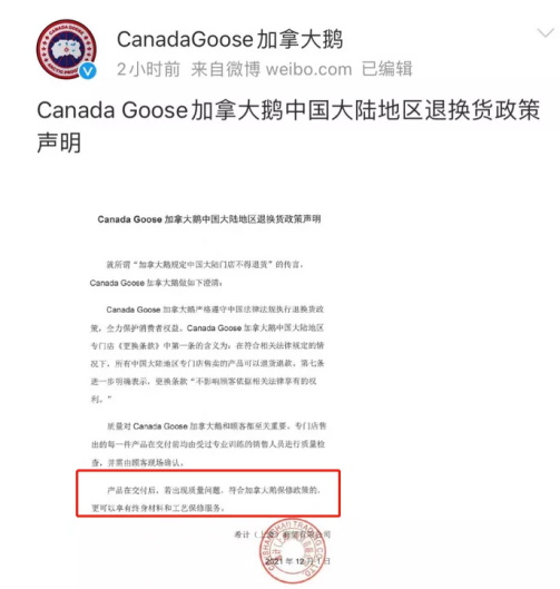加鹅当时就腿软了,火速发布认怂声明,修改退换货政策:符合相关法律规定的情况下,所有中国大陆地区专门店售卖的产品可以退货退款,还识相的加了一条,“产品交付后若出现质量问题,符合保修条款的享有终身材料和工艺保修服务”。