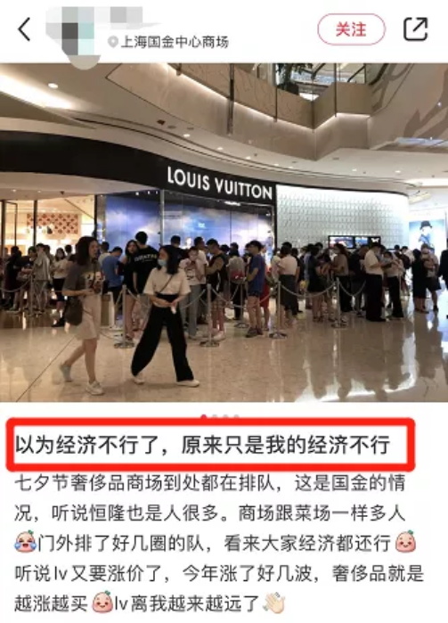 即便是在去年,多数人的经济条件都受到疫情影响,在广州、上海等一线城市的LV奢侈品门店,还能不时传来国人排队抢购的新闻。
