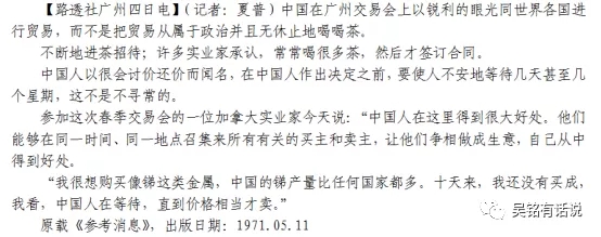 几个星期以前,一位同中国订了几百万美元的贸易合同的欧洲商人对我说:“中国人在讨价还价时不好对付,很清楚自己要些什么,在价格上一超过限度就不作打算。但是,他们诚实、公平。同中国做交易的即使是最挑剔的资本家也不会指责这里欺骗对手或者不遵守协议。”