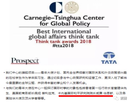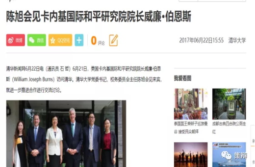 注意威廉.伯恩斯的站位,妥妥的C位之一。显然,清华-卡内基全球政策中心是把他作为了该中心的标志。其实也算正常,伯恩斯自2015年起,就是卡内基国际和平研究院的负责人。该中心的成立,本身就是2010年清华大学人文社会科学学院与卡内基国际和平研究院协作的结果。清华要打这个国际化的牌子,真的还得借卡内基这个名头。把威廉.伯恩斯当C位吉祥物,也算是应有之义。
