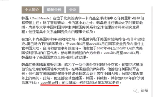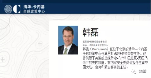清华-卡内基全球政策中心还有一个令人质疑与需要警惕的是:其负责人,中心主任韩磊(中文名),其英文名Paul Haenle的简历更令人质疑。
