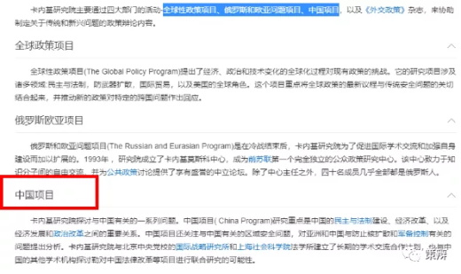 实际上,威廉伯恩斯成立“中国任务中心”,可谓准备充足:有思想准备、有物质准备、有人才准备。查阅卡内基国际和平研究院资料,发现其以国际和平的名义,吸纳全球人才进行的研究,设为三大项目:全球性政策项目、俄罗斯和欧亚问题项目、中国项目。