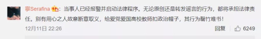 @寧Serafina 在22时26分发帖说:当事人已经报警并启动法律程序。无论原创还是转发谣言的行为,都将承担法律责任。别有用心之人故意断章取义,给爱党爱国高校教师扣政治帽子,其行为罄竹难书!