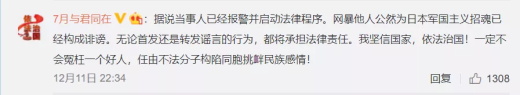 @7月与君同在 在22时34分发帖说:据说当事人已经报警并启动法律程序。网暴他人公然为日本军国主义招魂已经构成诽谤。无论首发还是转发谣言的行为,都将承担法律责任。我坚信国家,依法治国!一定不会冤枉一个好人,任由不法分子构陷同胞挑衅民族感情!