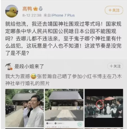 @高鸭 早在今年的8月12日,就发帖为参拜日本靖国神社的张哲瀚洗地,并公然叫嚣“国家规定哪条中华人民共和国公民啥日本公园不能围观?”