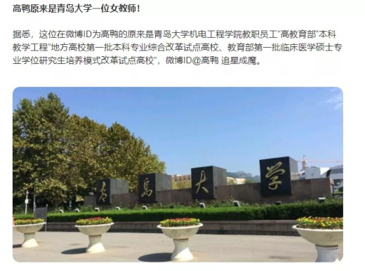 有自媒体称这个@高鸭 ,是青岛大学机电工程学校教师“高薇嘉”。