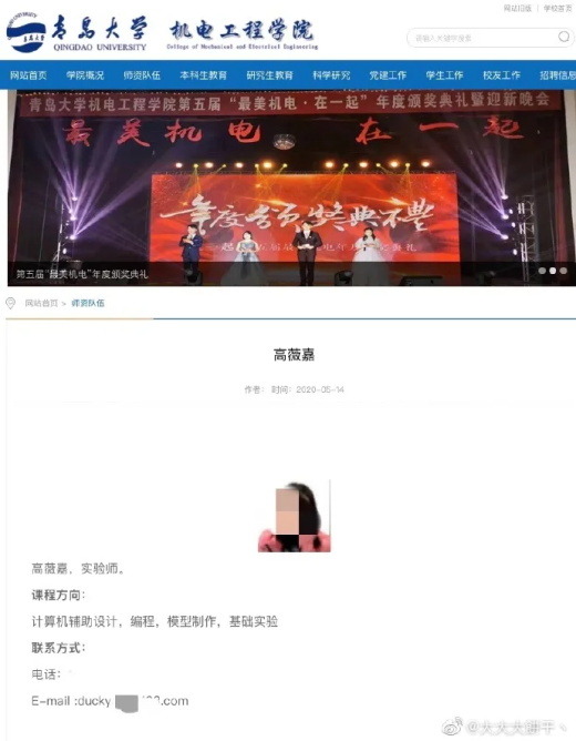 网民@大大大餅干丶 直指@高鸭 是青岛大学机电工程学院教职员工“高薇嘉”。