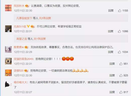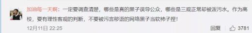 @加油每一天啊 在22时25分发帖说:一定要调查清楚,哪些是真的黑子误导公众,哪些是三观正常却被泼污水。作为高校,要有理性客观的判断,不要被污言秽语的网络黑子当软柿子捏!