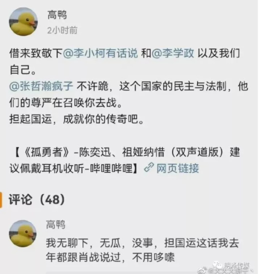 近日,@高鸭 还发帖叫嚣称“@张哲瀚疯子 不许跪,这个国家的民主与法制,他们的尊严在召唤你去战”。还妄称“担起国运”!