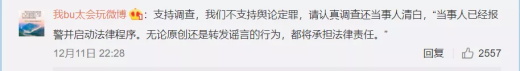 @我bu太会玩微博 在22时28分发帖说:支持调查,我们不支持舆论定罪,请认真调查还当事人清白,“当事人已经报警并启动法律程序。无论原创还是转发谣言的行为,都将承担法律责任。”