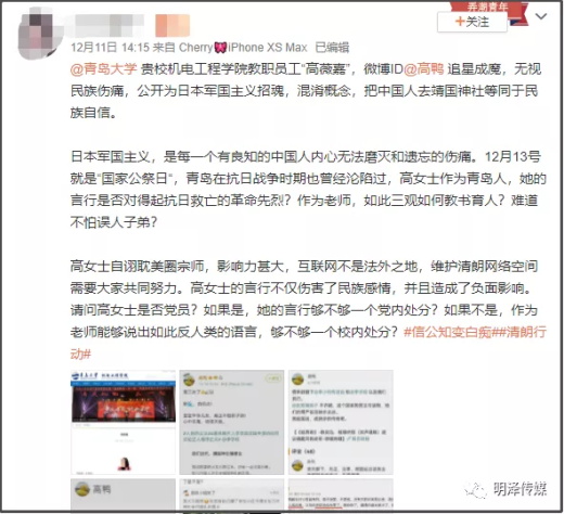 按说,张哲瀚身为明星却公然拜鬼之恶劣行为 ,早已经盖棺定论了,可是在国家公祭日前夕,青岛大学的一个女教师却突然如此挑衅,显然是有意为之。