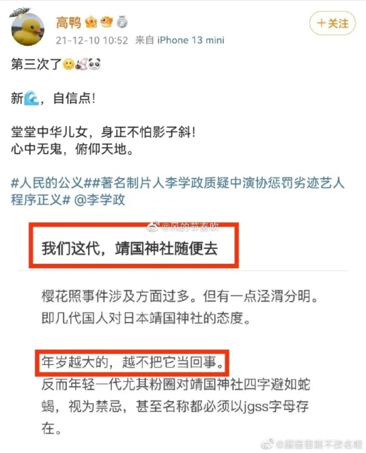 12月10日,网民@高鸭 发帖,称“我们这代人,靖国神社随便去”,还称“年岁越大的,越不把它(指参拜日本靖国神社)当回事。