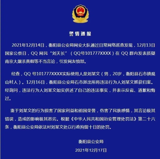 精日在国家公祭日那在QQ群公开质疑南京大屠杀,被警方依法行政拘留10日。