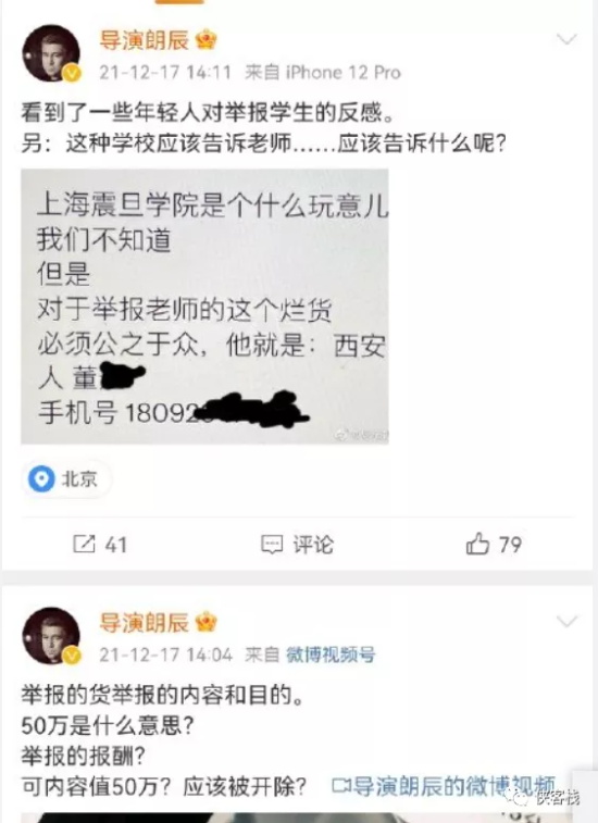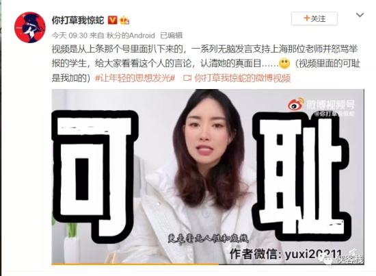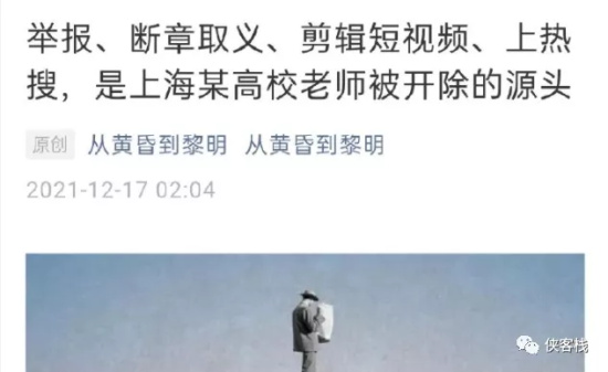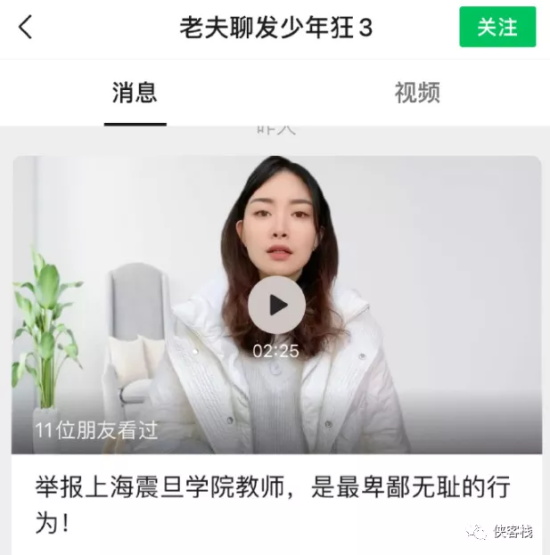 比如公众号“老夫聊发少年狂3”发视频《举报上海震旦学院教师,是最卑鄙无耻的行为》。