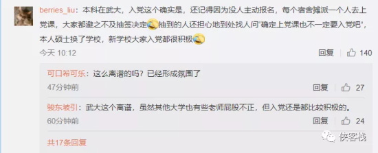 武汉大学学生@berries_liu 现身说法指出:本科在武大,入党这个确实是,还记得因为没人主动报名,每个宿舍摊派一个人去上党课,大家都避之不及抽签决定[允悲]抽到的人还担心地到处找人问“确定上党课也不一定要入党吧”,本人硕士换了学校,新学校大家入党都很积极[允悲]
