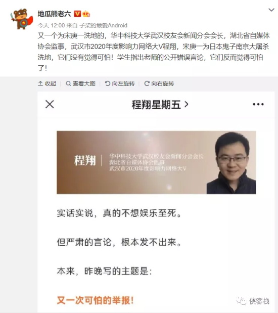 比如华中科技大学武汉校友会新闻分会会长,湖北省自媒体协会监事,武汉市2020年度影响力网络大V程翔在公众号“程翔星期五”中为宋庚一洗地,叫嚣“可怕的举报”。